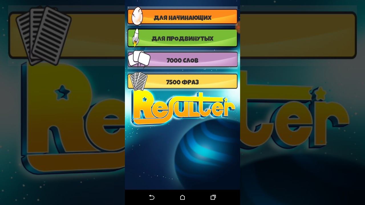 Ссылка на весь плейлист https://www.youtube.com/watch?v=zTfpLCKMGlU&list=PLKpNYhmfB_2G_V3OqDm7mvlpHhC2rdUDI Resulter - отличное бесплатное приложение для изучения английского . Беда в том, что его уже нет плеймаркете (возможно я его не нашел). Автор приложения - Александр Бебрис, на канале у которого очень много плейлистов для изучения не только английского, но и многих других языков (Немецкий, Китайский и т.д.) ссылка на один из его каналов: https://youtu.be/Hp9wUEDasY4 Поддержите канал, ребята, если есть желание. Я буду стараться добавлять видео чаще, буду рад каждой копеечке Заранее спасибо! Приятного Вам просмотра! Qiwi кошелек +79022116236