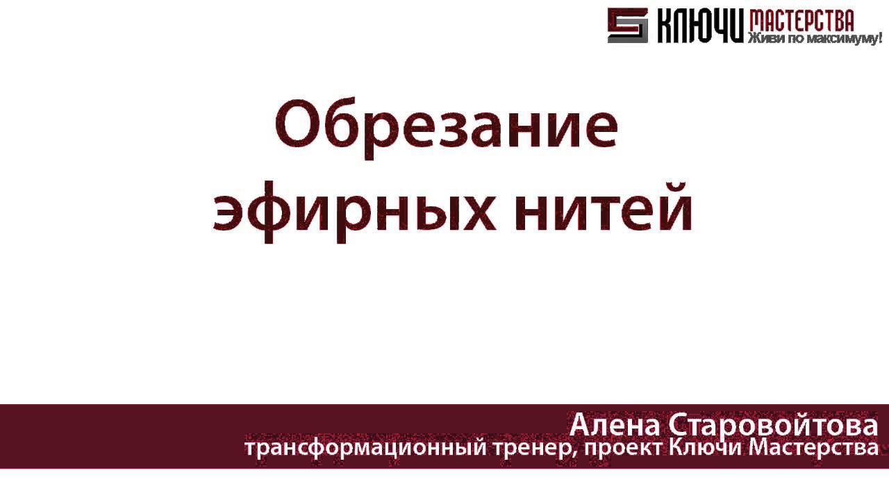 Обрезание эфирных нитей - техника для возвращения энергии. Она позволяет гармонизировать существующие отношения, а уже ненужные – легко и благополучно завершить. http://kluchimasterstva.ru/obrezaniye-efirnykh-nitey =========================================== ПОДПИШИТЕСЬ на наш Канал, чтобы не пропустить Новые Видео: http://kluchi.pro/1Dv9ecA ======================================= Ключи Мастерства http://kluchimasterstva.ru Facebook: https://www.facebook.com/KluchiMaster... ВКонтакте: http://vk.com/kluchimasterstva ======================================= Алена Старовойтова