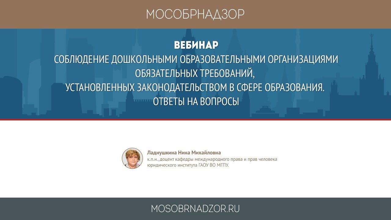 Вебинар «Соблюдение дошкольными образовательными организациями обязательных требований, установленных законодательством в сфере образования. Ответы на вопросы» был проведен в рамках проекта Мособрнадзор.РФ 27 сентября 2018 года. Ведущая вебинара - Ладнушкина Н.М. Страница вебинара на сайте проекта - http://mosobrnadzor.ru/supervision/webinars/2018-09-27_16-00