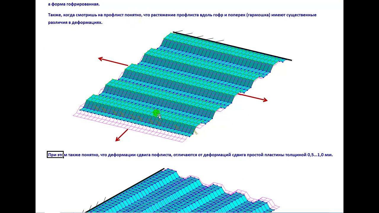 ЛИРА-САПР. Кровля из профлиста по прогонам из прокатного швеллера (ортотропия, совместная работа).
