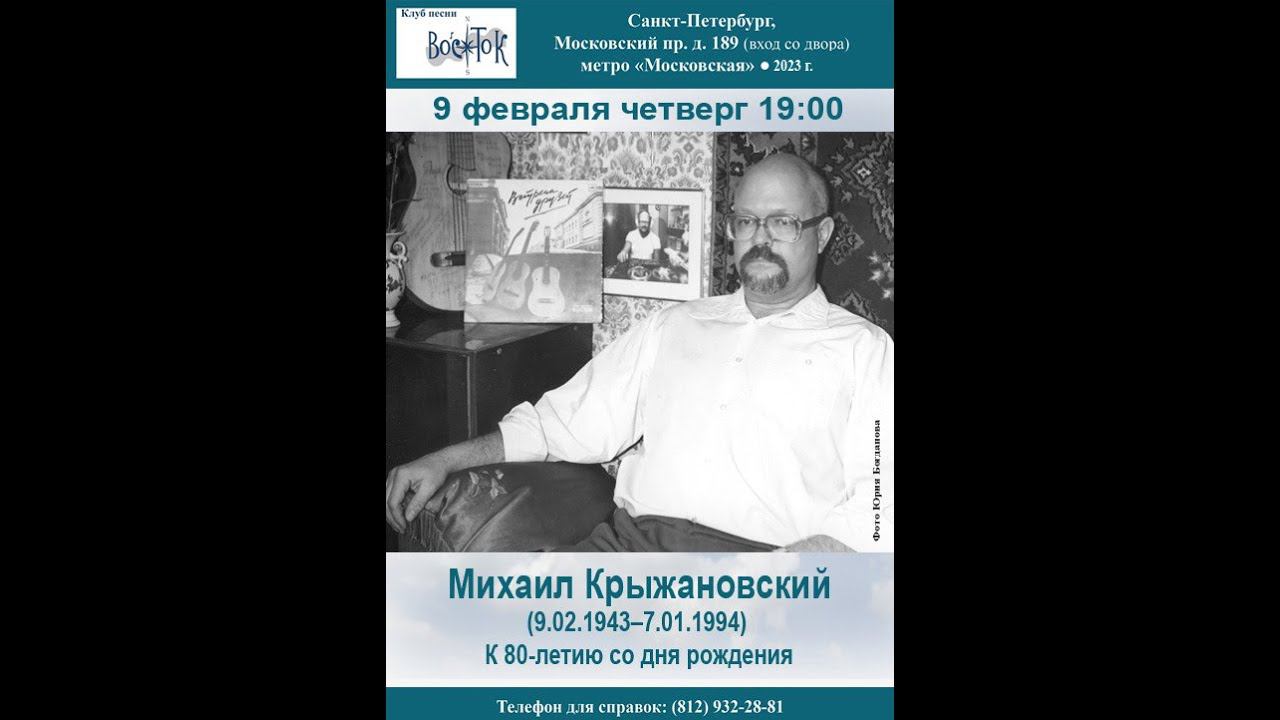 К 80-летию Михаила Крыжановского. Ведущие Алла Левитан и Валентин Вихорев. Клуб песни «Восток». 9 февраля 2023 г. Санкт-Петербург, Московский пр., д. 189. Афиша - Елена Демьянова. Видеозапись - Галина Барабохина. Запись звука - Геннадий Демин.