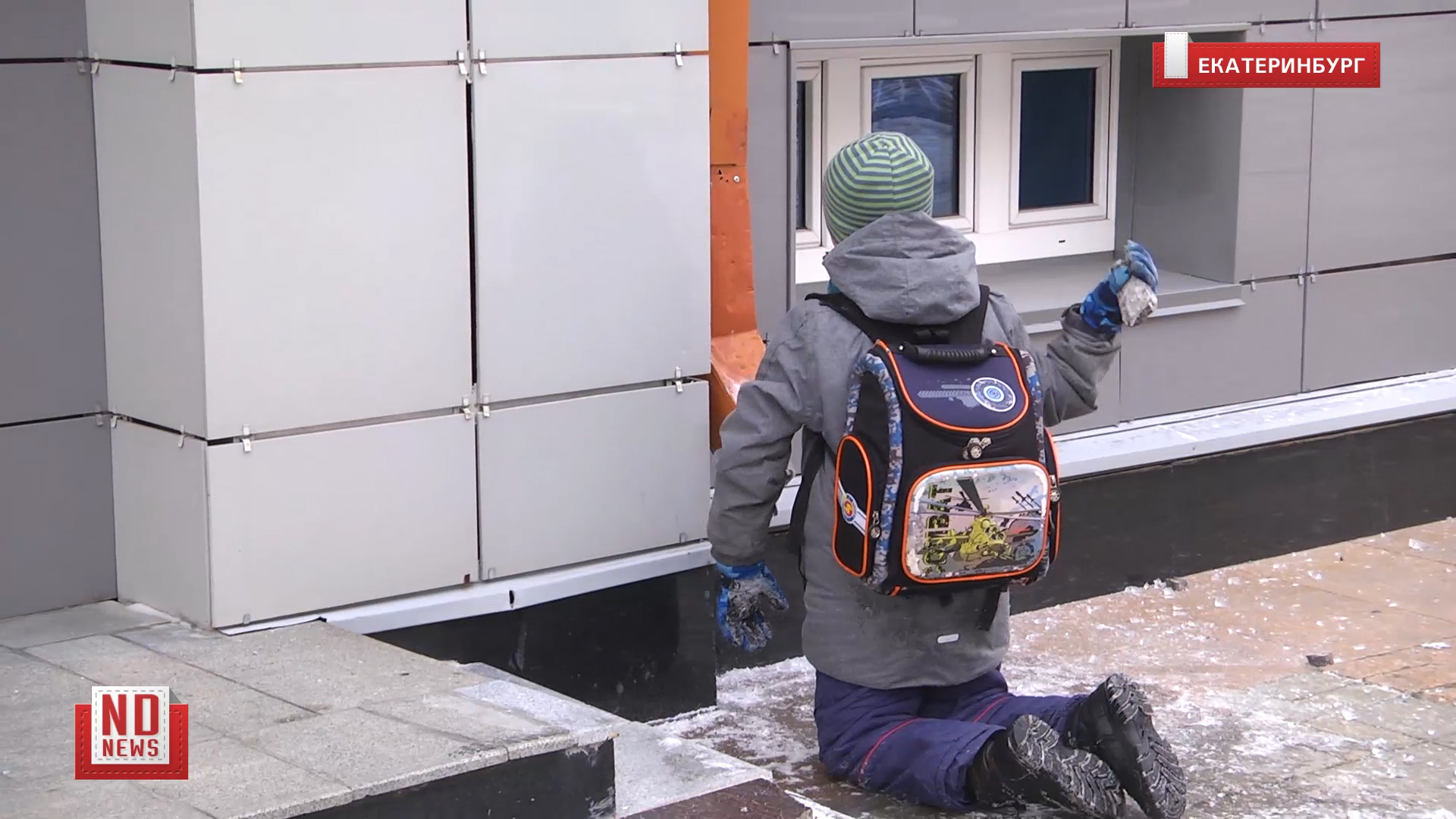 17 ноября 2020 года. Съемочная группа «Нового Дня» во время записи опроса на улице Вайнера в Екатеринбурге застала забавную сценку. Маленький мальчик, судя по рюкзаку, школьник, сидя у крыльца министерства здравоохранения Свердловской области с упоением ковырял водосточную трубу, периодически стуча по ней, пытаясь, видимо, таким образом достать оттуда ледышки и отрезок кабеля. Периодически парень переключался на камень и молотил им по наледи под трубой. Ледяная крошка попала ему в глаз, что ему не понравилось, и он зло выругался. Школьник провел под крыльцом минздрава никак не меньше получаса, но ни охранники из ведомства, ни прохожие на мальчика никакого внимания не обращали.