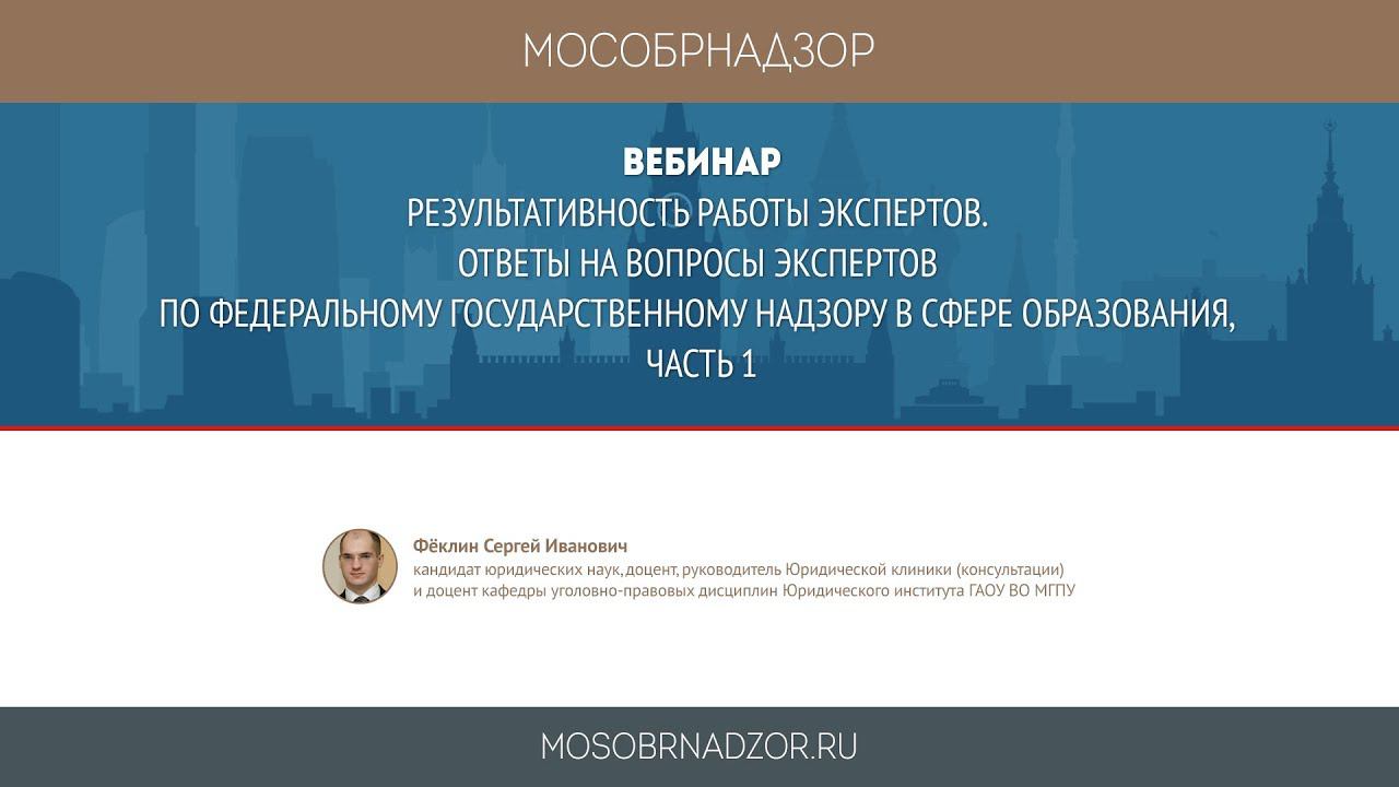 Вебинар «Результативность работы экспертов. Ответы на вопросы экспертов по федеральному государственному надзору в сфере образования, часть 1» был проведен в рамках проекта Мособрнадзор.РФ 20 июля 2018 года. Ведущий вебинара - Феклин С.И. Страница вебинара на сайте проекта - http://mosobrnadzor.ru/supervision/webinars/2018-07-20_12-00