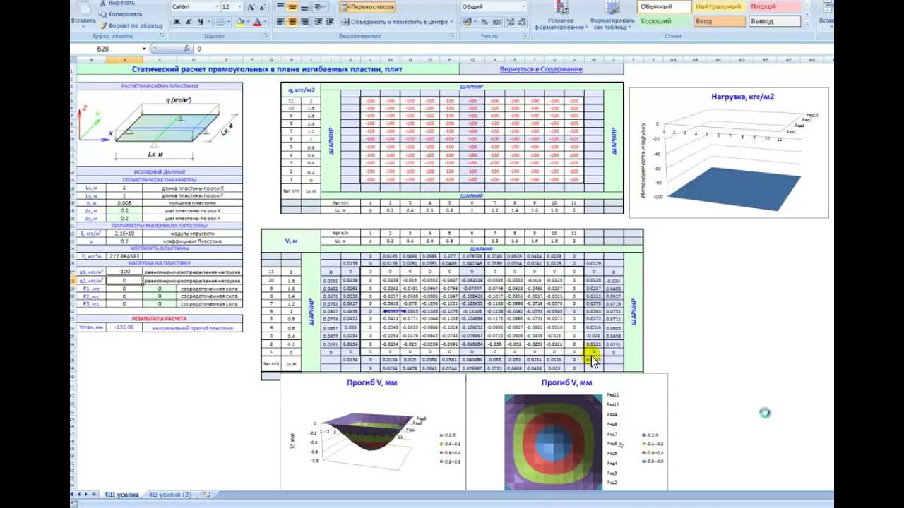 Плиты, в том числе на упругом основании. Решение НДС в обычном Excel. Вебинары проф. Макеева С.А.