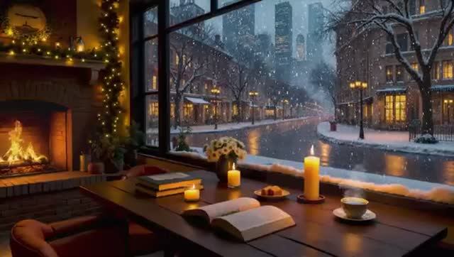 Атмосфера кафе. Музыка. Снежный город с мягкой джазовой музыкой и уютным потрескиванием камина