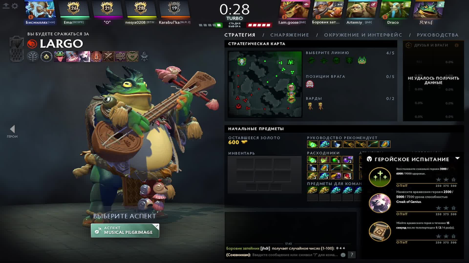 Ларго (Largo) — это герой ближнего боя с основным атрибутом «Сила», выпущенный в декабре 2025 года, который представляет собой лягушку-барда из изгнанного племени Муркрут. Его геймплей строится вокруг контроля целей липким языком, призыва оглушающих лягушат и уникальной механики ритм-игры в ультимейте, позволяющей усиливать союзников песнями в зависимости от точности попадания игрока в такт. Оказывается реф. отсутствует 2025 на -https://market.csgo.com/- но можно продать выгодно Ларго песни поёт на лютне, Языком достаёт врагов, И смеётся над всеми путно, Но даже ходит сухопутно.