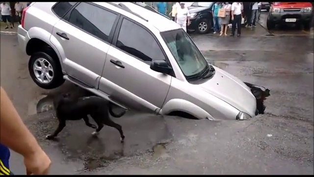 Асфальт провалился на дороге, образовав огромную дыру, в которую начало затягивать автомобиль под его собственным весом. #автомобиль #яма #дыра