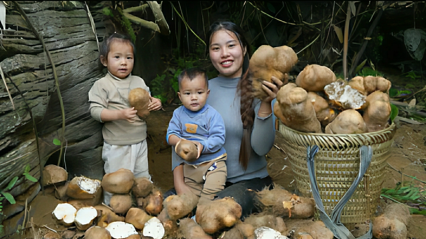 Собираю дикорастущие клубни и везу их на рынок для продажи. Еда для семьи из клубень. Вьетнам
