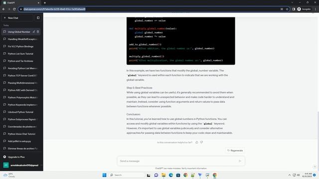 Title: Using Global Numbers in Python Functions Introduction: In Python, you can use global variables within functions by declaring them as 'global' within the function's scope. This allows you to work with and modify global variables from within a function. In this tutorial, we will discuss how to use global numbers in Python functions with code examples. Step 1: Defining a Global Number To use a global number in a Python function, you need to define the variable outside of any function. Here's an example of declaring a global number: Step 2: Accessing the Global Number Now, let's create a function that accesses the global_number variable: In this example, we've defined a function access_global_number that simply prints the value of the global_number variable. Step 3: Modifying the Global Number You can also modify the global_number within a function by using the global keyword. Here's an example: This code defines a function modify_global_number, which increments the global_number by 5. The global keyword is used to indicate that we want to modify the global variable. Step 4: Using Global Numbers in Multiple Functions You can use the global_number in multiple functions as long as you declare it as global within each function where you intend to modify it. Here's an example with two functions: In this example, we have two functions that modify the global_number variable. The global keyword is used within each function to indicate that we are working with the global variable. Step 5: Best Practices While using global variables can be useful, it's generally recommended to avoid them when possible, as they can lead to unexpected behavior and make code harder to understand and maintain. Instead, consider using function arguments and return values to pass data between functions whenever possible. Conclusion: In this tutorial, you've learned how to use global numbers in Python functions. You can access and modify global variables within functions by using the global keyword. However, it's important to use global variables judiciously and consider alternative approaches for passing data between functions to keep your code clean and maintainable. ChatGPT