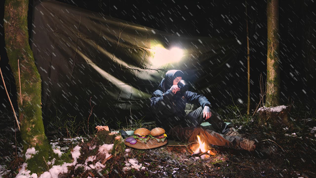 24 часа бушкрафт выживание в лесу ЗИМОЙ без палатки, только тент: приготовление бургеров на огне