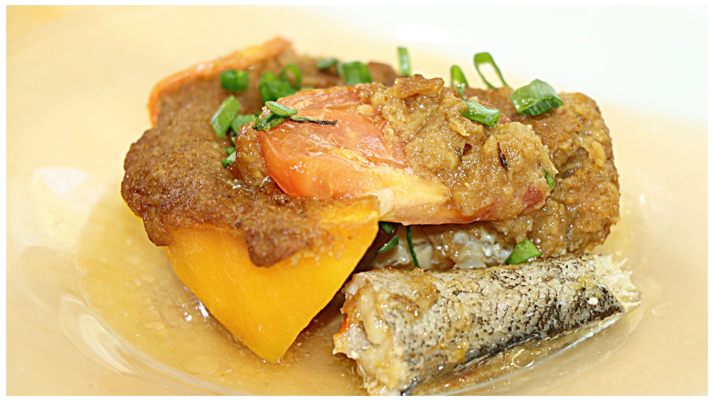 Потребуется: - тыква - 400 г - тыквенное пюре - 150 г - растительное масло - 50 мл соевый соус - 50 мл - томатный соус - 50 мл - специи, соль - помидор - 2 шт. - лук - 1 шт. - рыба - 300 г
