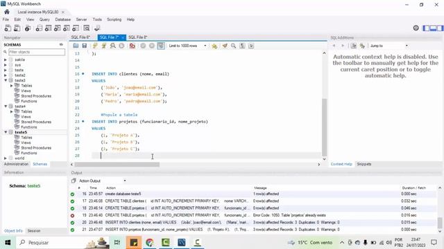 vamos aprender a unir tabelas ? INNER JOIN é uma cláusula que permite a junção entre duas ou mais tabelas, desde que hajam entrelaçamento entre todas. INNER JOIN é uma cláusula que permite a junção entre duas ou mais tabelas, desde que hajam entrelaçamento entre todas. Right join: Retorna todos os registros da tabela direita e os registros correspondentes da tabela esquerda. left join: Use a operação LEFT JOIN para criar uma junção externa esquerda Aula 0 - instalação e configuração Aula 1 - Select From Aula 2 - Where Aula 3 - Where, and, or, between Aula 4 - Where, is null, is not null Aula 5 - Criar e apagar Banco (Em Breve) Aula 6 - Criar e apagar tabela ( Em Breve) Aula 7 - Inserir dados na tabela ( Em Breve) Aula 8 - Atualizar tabela ( Em Breve ) Aula 9 - Alterar Tabela ( Em Breve ) Aula 10 - Integridade Referencial Aula 11 - Junção de tabelas - Joins - ( Em Breve) Aula 12 - funções de agregação ( Em Breve) Aula 13 - funções de tratamento ( Em Breve) Aula 14 - subconsult ( Em Breve) #mysql #sql #bancodedados
