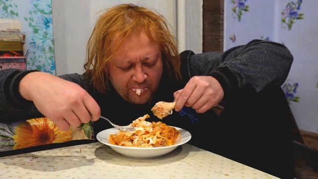 Деревенский мужик после домашних дел съел вечерний ужин с итальянской пастой российского производст.