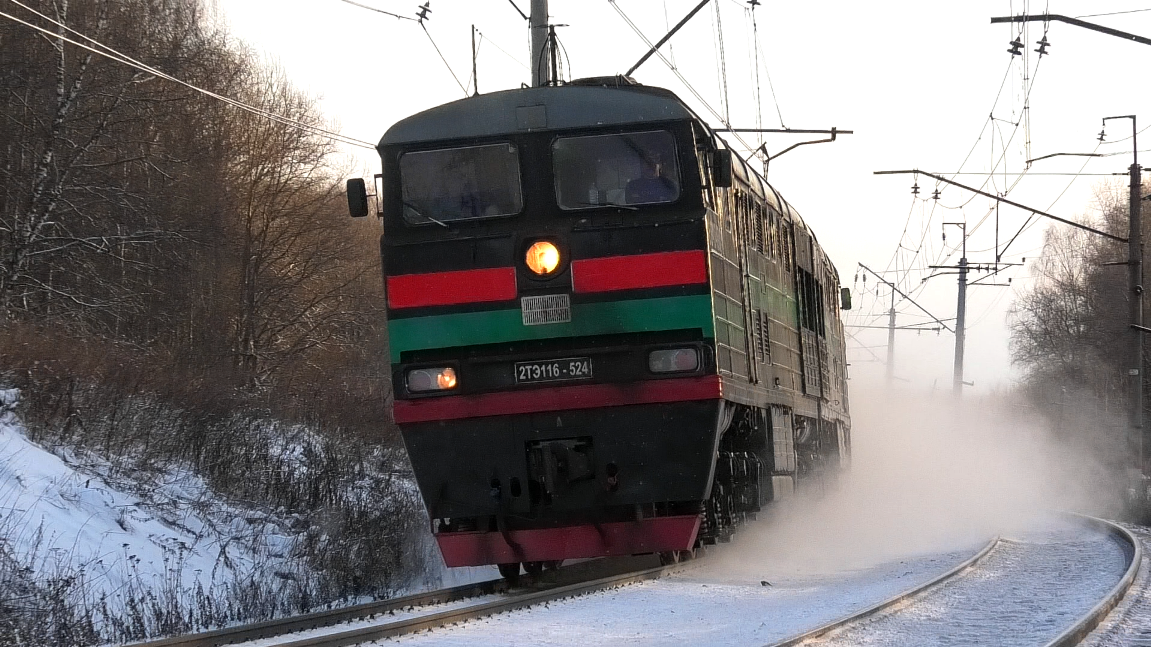 Тепловоз 2ТЭ116-524 с грузовым поездом следует по перегону Чисмена - Волоколамск. Московская ЖД. Московская область, Россия. Приписка: ООО «БалтТрансСервис». 04.12.2021