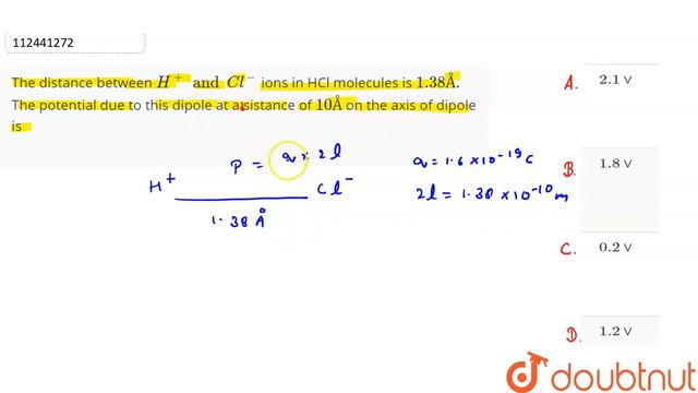 The distance between H^(+) and Cl^(-) ions in HCl molecules is 1.38Å. The potential due to this dipole at a distance of 10Å on the axis of dipole is Class: 12 Subject: PHYSICS Chapter: ELECTROSTATIC POTENTIAL AND CAPACITANCE Board:NEET You can ask any doubt from class 6-12, JEE, NEET, Teaching, SSC, Defense and Banking exam on Doubtnut App or You can Whatsapp us at - 8400400400 Link - https://doubtnut.app.link/2um0jr7Joeb Join our courses to improve your performance and Clear your concepts from basic for Class 6-12 School and Competitive exams (JEE/NEET) - https://doubtnut.app.link/POyZDvv5Lyb Contact Us: 👉 Have Any Query? Ask Us. 🤙 Call: 01247158250 💬 WhatsApp: 8400400400 📧 Email: info@doubtnut.com 🌐 Website: https://www.doubtnut.com Welcome to Doubtnut. Doubtnut is World’s Biggest Platform for Video Solutions of Physics, Chemistry, Maths and Biology Doubts with over 5 million+ Video Solutions. Doubtnut is a Q&A App for Maths, Physics, Chemistry and Biology (up to JEE Advanced and NEET Level), Where You Can Ask Unlimited Questions by Clicking a Picture of Doubt on the Doubtnut App and Get Instant Video Solution. Subscribe Our YouTube Channels: ✿ Doubtnut: https://www.youtube.com/channel/UCcv7pspGHmM7AOywuLM1ufA?sub_confirmation=1 ✿ Class 11-12, JEE & NEET (Hindi): https://www.youtube.com/channel/UCiIrZf4bn1i0IOf8YgSMzWA?sub_confirmation=1 ✿ Class 11-12, JEE & NEET (English):: https://www.youtube.com/channel/UCbJ_xe2bMLo9yuBC-i_13MQ?sub_confirmation=1 ✿ Class 6-10 (Hindi): https://www.youtube.com/channel/UCZnV1hkn5A3fdpTOVi60tzg?sub_confirmation=1 ✿ Class 6-10 (English): https://www.youtube.com/channel/UC9KeHSWOEBXIrbWYasHeSyg?sub_confirmation=1 ✿ Doubtnut Govt. Exams: https://www.youtube.com/channel/UCWPaROsU_06MSqiZ_O6zaVg?sub_confirmation=1 Follow Us: 🔔 Facebook: https://www.facebook.com/doubtnut 🔔 Instagram: https://www.instagram.com/doubtnut 🔔 Telegram: https://t.me/DoubtnutOfficial 🔔 Twitter: https://twitter.com/DoubtnutApp 🔔 LinkedIn: https://www.linkedin.com/company/doubtnut Our Telegram Pages: 🔔 Doubtnut Official: https://t.me/DoubtnutOfficial 🔔 Doubtnut IIT JEE: https://t.me/DoubtnutIITJEE 🔔 Doubtnut NEET: https://t.me/Doubtnut_NEET 🔔 Doubtnut CBSE Boards: https://t.me/DoubtnutCBSEBoards 🔔 Doubtnut UP Boards: https://t.me/DoubtnutUPBoards 🔔 Doubtnut Bihar Boards: https://t.me/DoubtnutBiharBoards 🔔 Doubtnut Government Exams: https://t.me/DoubtnutGovernmentExams class 12 class 12 physics class 12 chemistry class 12 english class 12 maths class 12 biology cbse class 12 result class 12 economics class 12 accountancy class 12 syllabus physics cbse class 12 class 12 english grammar class 12 syllabus cbse class 12 history class 12 geography class 12 ncert class 12 syllabus cbse class 12 maths cbse class 12 english cbse class 12 physics cbse class 12 chemistry class 12 grammar cbse class 12 biology cbse class 12 commerce cbse class 12 accountancy class 12 syllabus chemistry class 12 grammar syllabus class 12 syllabus maths class 12 latest syllabus class 12 syllabus english class 12 syllabus biology class 12 syllabus of physics class 12 syllabus of chemistry class 12 syllabus science class 12 syllabus ncert class 12 syllabus of english class 12 syllabus commerce