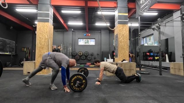 Комплекс 12AMRAP 30 взятий в стойку 50 kg 30 фронтальных приседаний 30 подьемов с плеч над головой 30 взятий в сел с виса + подьем над головой Каждую смену начинать с 3 фронтальных берпи через штангу * 125 (повторения) Делали с Пашей Комплекс На время: 10 раундов 5 подносов ног 7 прыжков на коробку 10 рывков гантели * 09:20 (время)