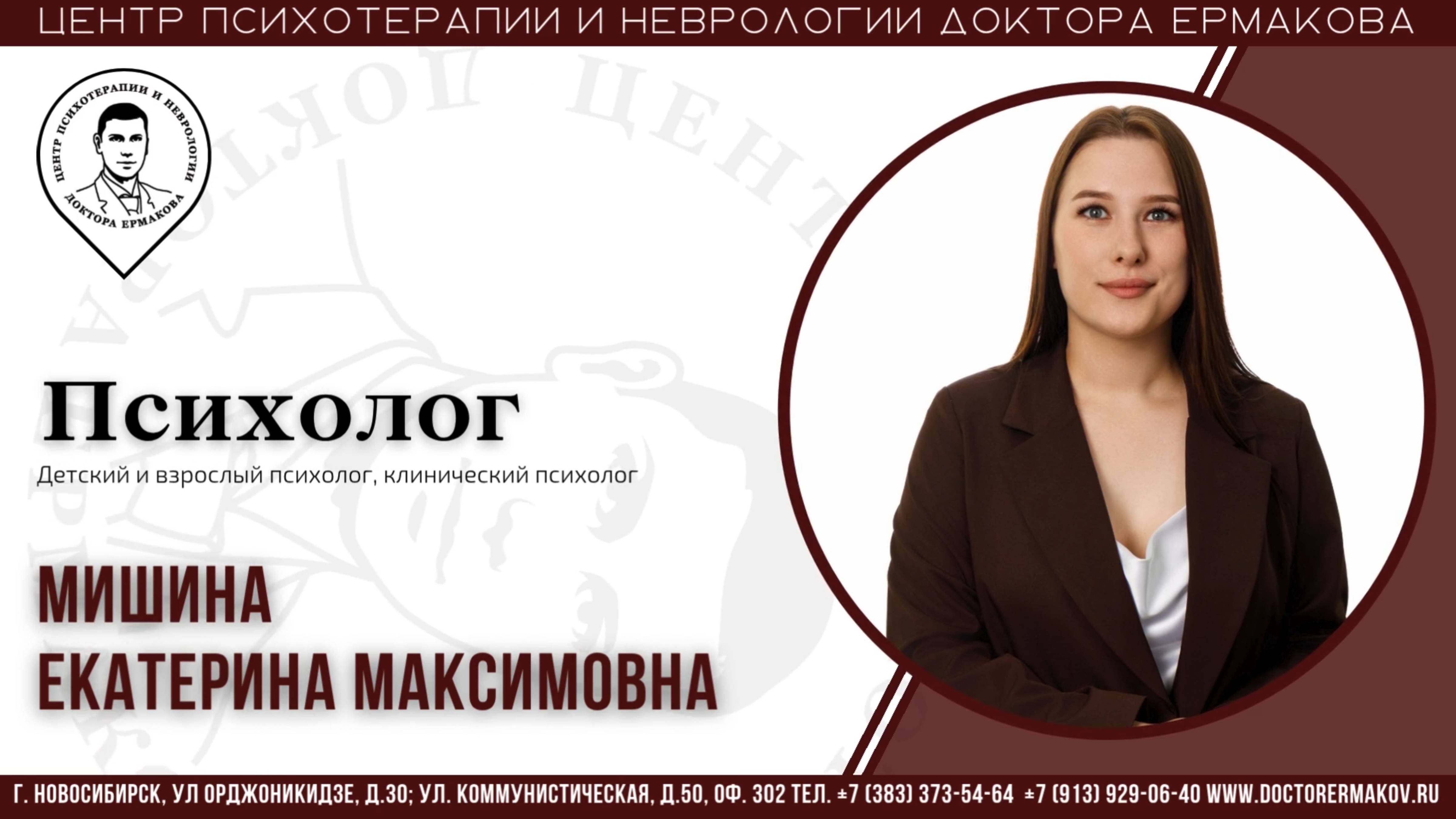 ВОЗМОЖНЫ ПРОТИВОПОКАЗАНИЯ, НЕОБХОДИМА КОНСУЛЬТАЦИЯ СПЕЦИАЛИСТА. Запись на прием к специалисту: https://clck.ru/3GD5xD Детский и взрослый психолог, клинический психолог Опыт работы с 2023 года Методы психотерапии: Психоаналитическая терапия Вы можете обратиться ко мне если: чувствуете тревогу, стресс испытываете проблемы в межличностных отношениях хотели бы улучшить самооценку возникают трудности в общении переживаете расставание Также работаю с: фобиями агрессией, раздражением обидой чувством одиночества депрессивными состояниями детско-родительскими отношениями Психоаналитическая работа с детьми от 4 до 10 лет: страхи, замкнутость, агрессия у детей; трудности адаптации в коллективе сверстников; воровство, плохое поведение; ребенок не слушается, частые капризы, истерики; навязчивости – сосет палец, грызет ногти; отсутствие речи. Образование: Новосибирский государственный педагогический университет. Педагог-психолог. Институт современной психотерапии и психологии. Клинический психолог. Национальный исследовательский институт дополнительного образования. Медицинская логопедия. Повышение квалификации, курсы: Основы психотерапевтической работы с детьми, 2023 Современные диагнозы с позиции психоанализа, 2023 Юнгианский анализ и архетипическая психология, 2023 Теория объектных отношений, 2024 КПТ-5. Высший пилотаж. Авторский курс Даргиса А.Л., 2024-2025 Психосоматика. Неврозы. КПТ-1, 2023 Психоаналитическая терапия. Теория, фокусированная на переносе О.Кернберга, 2024 Аддиктология. КПТ-1. Психотерапия РПП, 2024 Практика психодрамы, 2024 Структурально-семиотический анализ Жака Лакана, 2024 ЦЕНТР ПСИХОТЕРАПИИ И НЕВРОЛОГИИИ ДОКТОРА ЕРМАКОВА Телефон: +7-383-373-5464; +7-913-929-0640 Сайт: doctorermakov.ru/ Вконтакте: vk.com/doctorermakov RUTUBE: https://rutube.ru/channel/1123216/ WA: wa.me/79139290640 Telegram: t.me/doctorermakov Лицензия на осуществление медицинской деятельности № ЛО-54-01-005884 ООО «Доктор Ермаков". ОГРН 1155476097732 ИНН 5410052570 КПП 540601001