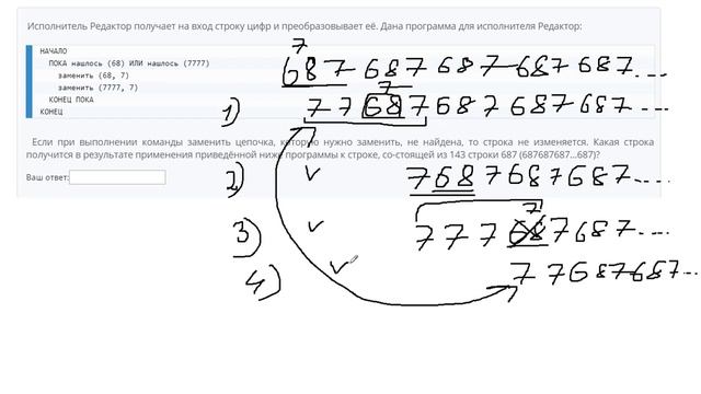 http://egoroffartem.pythonanywhere.com/ege/task/14 На сайте размещены другие задания по этой теме http://egoroffartem.pythonanywhere.com/ege/videotask/14 Список всех разборов 14 задания из ЕГЭ по информатике: https://www.egoroffartem.ru/ege/videotask/ Видео решения задач по ЕГЭ информатике https://vk.com/egoroff_channel В данном группе можете найти информацию о новых видео и задать вопросы по ЕГЭ Информатике Исполнитель Редактор получает на вход строку цифр и преобразовывает её. Дана программа для исполнителя Редактор: НАЧАЛО ПОКА нашлось (68) ИЛИ нашлось (7777) заменить (68, 7) заменить (7777, 7) КОНЕЦ ПОКА КОНЕЦ Если при выполнении команды заменить цепочка, которую нужно заменить, не найдена, то строка не изменяется. Какая строка получится в результате применения приведённой ниже программы к строке, состоящей из 143 строки 687 (687687687…687)? Разбор задания № 14 ЕГЭ ИНФОРМАТИКА Тема задачи "Анализ и выполнение алгоритмов для исполнителя"