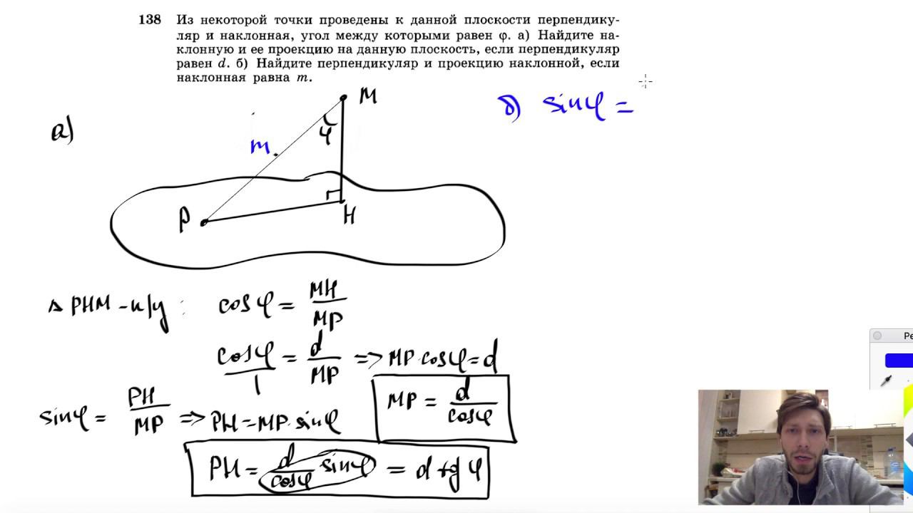 №138. Из некоторой точки проведены к данной плоскости перпендикуляр и наклонная, угол между которыми равен φ. а) Найдите наклонную и ее проекцию на данную плоскость, если перпендикуляр равен d. б) Найдите перпендикуляр и проекцию наклонной, если наклонная равна m. Поддержать канал рублём - 5469400944002125 (Сбербанк) Мой второй канал для подготовки к ЕГЭ и ОГЭ - https://www.youtube.com/ЕвгенийСумин Инстаграм - https://www.instagram.com/EGE_OGE.math Личный инстаграм - https://www.instagram.com/ee_sumin VK - https://vk.com/evgeniysumin FB - https://www.facebook.com/EvgeniySumin