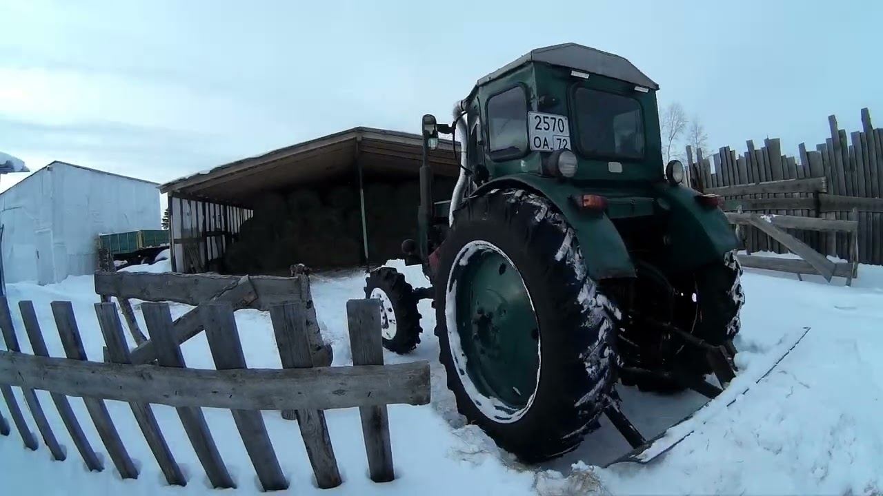 Расчищаю снег на территории перед разгрузкой сена. Накопилось за месяц. Т-40 с лопатой