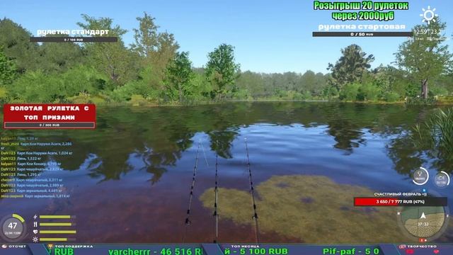 Поддержка донатом https://www.donationalerts.com/r/kalyamba11 Альтернативный донат https://new.donatepay.ru/@1032463 5536913964533059 карта Тинькоф Если стрим лагает,смотри стрим на трово https://trovo.live/s/Kalyamba_na_Ribalke Мой ВК - https://vk.com/kalyantv НИК в игре kalyan11 НАШ ДИСКОРД СЕРВЕР https://discord.gg/mSbnTJK8TB Заказ водоема на 1 час - 500р ( весь стрим 2500р ) Модерка на канале 1200р ( каждая следующая на 100р больше) Озвучка доната на 40р,50р,100р,200р,300р,500р,1000р ✅Призы в рулетке "ЗОЛОТАЯ" ✔ ЗОЛОТО ✔ ПРЕМ ✔ КАТУШКИ РАПТОР 40, АЗИМУТ 10000, СИЛЬВЕР 80, ТАЙГА с 30 ✔ ПАЛКИ ПИЛКЕРНАЯ, ДОНКА МОРСКИЕ, ✔ РОД ПОД, СТУЛЬЯ ✅Призы в рулетке СТАНДАРТ : ✔ катушка "РАПТОР 40" ✔ катушка "АЗИМУТ 10000" ✔ катушка "ТАЙГА С30, С40," ✔ катушки 60 для медного ( ЭВИИ, НАТОРЫ, ГОЛДА, и тд) ✔ ПИЛКЕРНОЕ УДИЛИЩЕ КОРОЛЕВА ОКЕАНА ✔ Морское Донное удилище ✔ прем ( 3, 7, 30 дней) ✔ золото ( 1, 3, 5, 10, 20 ,50) ✔ билет на море ( 1, 3, 5 дней) ✔ голд наживка и др. ✅Призы в рулетке "СТАРТОВАЯ" ✔ катушка "silver80" ✔ катушка "БЕЛЫЙ КАЛИБР" ✔ катушка "Черный калибр" ✔ катушка "Протон" ✔ катушка "Нарга 6000" ✔ Набор Фидерист и спинингист ✔ Карповик Фортуна ✔ фидерные удилища ✔ прем, золото, алкашка, наживки и тд P.s Рулетка это не казино, а награда за поддержку стримера. Вечный ТОП ПОДДЕРЖКИ (11.05.2024) 1. Dimon_pokemonchik 119 784 2. Interceptor 75 508 3. Skreb79 71 261 4. une personne 68 619 5. Нарвал77 31 550