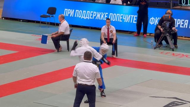 19.10.2025 в Москве прошли VIII Всероссийские соревнования по кудо «К2». Бой в категории до 230 ед. 14-15 лет. В синем Евгений Карпов (УрФО, г. Магнитогорск), в белом Даниил Заболотский (г. Москва, СК «Профессионал»).