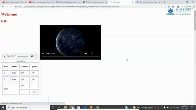 Blue Pearl Computer Education - WE TRA1N Y0UR BRA1N - Welcomes you to our Logical Session. HTML CSS Interview Questions and Answers | HTML CSS Tutorials for beginners Live code explanations https://youtube.com/playlist?list=PLzi-I0qxzn6KW_OdXL8scx8bVM-M2TJqo Like, Comment, Share this playlist. CSS Units: vh, vw, vmin, vmax #css #responsive #design Simple Explanation Of rem & em CSS Units CSS width & height, object-fit, overflow, and CSS units (ems, rems, vw, vmin, fr, ch, and more) Introduction to Viewport Units Telegram Link join for Interview information: https://t.me/bluepearlcomputereducation We Are socially always Presents 24/7 Facebook: https://www.facebook.com/bluepearl.co.in Twitter: https://twitter.com/bluepearl_co_in Instagram: https://www.instagram.com/bluepearl.co.in Pinterest: https://id.pinterest.com/bluepearlc LinkedIn: https://www.linkedin.com/company/bluepearl-computer-education #html #css #interview #questions #answers #examples #tamil #madurai #itjobmadurai #maduraiitcompanies #itcompanyaddress 1. What is the difference between a block-level element and an inline element? 2. Is it possible to change an inline element into a block level element? 3. Are the HTML tags and elements the same thing? 4. What are Attributes and how do you use them? 5. What is the ‘class’ attribute in HTML? 6. What is the difference between the ‘id’ attribute and the ‘class’ attribute of HTML elements? 7. Name some common lists that are used when designing a page. 8. Does a hyperlink only apply to text? 9. How to specify the link in HTML and explain the target attribute? 10. How do you create text on a webpage that allows you to send an email when clicked? 11. What is SVG? 12. How many types of CSS can be included in HTML? 13. Describe HTML layout structure. 14. What is the difference between strongb tags and emi tags? 15. What is the significance of head and body tag in HTML? 16. Can we display a web page inside a web page or Is nesting of webpages possible? 17. What are the HTML tags used to display the data in the tabular form? 18. How is Cell Padding different from Cell Spacing? 19. How can we club two or more rows or columns into a single row or column in an HTML table? 20. What is the difference between “display: none” and “visibility: hidden”when used as attributes to the HTML element? 21. Difference between link tag link and anchor tag a? 22. What are forms and how to create forms in HTML? 23. What are some of the advantages of HTML5 over its previous versions? 24. How can we include audio or video in a webpage? 25. Is the data list tag and select tag same? 26. Is drag and drop possible using HTML5 and how? 27. What is new about the relationship between the header and h1 tags in HTML5? 28. What is the difference between DIV and SPAN in HTML? 29. What is the purpose of using alternative texts in images? 30. Is the DOCTYPE html tag considered as a HTML tag? 31. What is the hierarchy that is being followed when it comes to style sheets? 32. What is the Box model in CSS? Which CSS properties are a part of it? 33. What are the different types of Selectors in CSS? 34. What is VH/VW (viewport height/ viewport width) in CSS? 35. What is the difference between inlineinline-blockand block? 36. Is it important to test the webpage in different browsers? 37. How do you specify units in the CSS?. What are the different ways to do it? 38. Does margin-top or margin-bottom have an effect on inline elements? 39. How is border-box different from content-box? 40. What is an image map? 41. How do you create links to sections on the same page? 42. What if there is no text between the tags or if a text was omitted by mistake? Will it affect the display of the HTML file? 43. What is a marquee? 44. Tell me two benefits of HTML5 Web Storage 45. Draw a circle using CSS? 46. Which one of [IDclass] selector has higher priority? 47. How would you use media queries in a mobile-first approach? 48. Explain the term Responsive web design. 49. Q. What are the standard media queries used in current trends for mobile technology? 50. How can we add icons to the web page? 51. Define ‘important’ declarations used in CSS. html CSS interview questions and answers html CSS interview questions and answers for freshers html CSS interview questions and answers for experienced interview questions and answers HTML Tamil Tamil HTML Training HTML For Beginners Free HTML Course HTML in Tamil HTML Full Tutorial HTML Tutorial Tamil HTML Beginners HTML Basics HTML Introduction HTML basic interview HTML interview question HTML interview questions and answers for freshers pdf HTML interview questions Basic HTML interview questions Advanced HTML interview questions HTML Interview Questions and answers with examples Interview Questions for HTML Developer Interview Questions for HTML Coder Interview Questions for UI Developer HTML interview questions and answers Reach us @ 8608687877WhatsApp - 86751422218675142228 Website: www.bluepearl.co.in