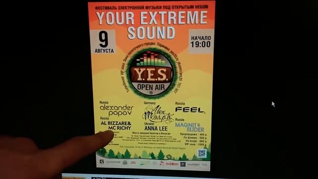 9 августа 2014 г. под открытым небом пройдет самый громкий OPEN AIR на территории Северо-Запада России – Третий ежегодный фестиваль электронной музыки «YOUR EXTREME SOUND» http://yes35.ru/openair2014 В этом году на фестивале вас ждут ди-джеи из топ-листа России и Мира: Alex M.O.R.P.H., Alexander Popov, Feel, Anna Lee, Magnit & Slider, Al Bizzare & Mc Richy. Начало – 19.00 Окончание 06:00 Вся информация о хедлайнерах фестиваля: http://yes35.ru/headliners2014 Информация по билетам: http://yes35.ru/tickets-openair «YOUR EXTREME SOUND» - ЭТО ТВОЙ OPEN AIR..... НЕ ПРОПУСТИ!