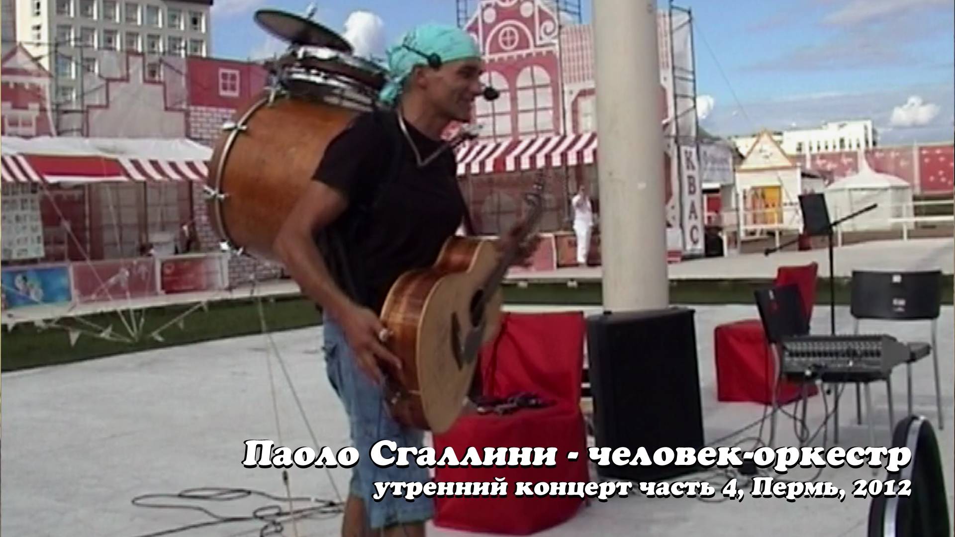 ПАОЛО СГАЛЛИНИ, человек-оркестр (Пермь 2012г.). Утренний концерт, часть 4 / 4. Еще раз представляю вам моего лучшего итальянского друга Паоло Сгаллини. Он профессиональный музыкант из Римини, играет на гитаре, укулеле, ударных инструментах, гармонике, казу. В его репертуаре песни известных исполнителей: Битлз, Пинк Флойд, Боб Дилан, Карл Перкинс, Брюс Спрингстин, Джон Денвер, Джонни Кэш и многих других. В июле 2012г. Паоло был приглашен на фестиваль Белые ночи в Пермь. Я с моим другом Ильей Васильевым (он тоже профессиональный музыкант, композитор, поэт и участник дуэта Пигмалион) специально приехали в Пермь для встречи с Паоло. Мне удалось снять на видео два концерта Паоло: утренний (который я разделил на 4 части) и вечерний (разделен мною на 5 частей). В вечернем концерте интересно наблюдать, как к Паоло присоединяются два молодых пермских музыканта. Сначала очень удачно подключился молодой парень с барабаном Тарабука (у Паоло к этому моменту начались неполадки с его ударной установкой). А затем к ним примкнул молодой гитарист. Так случайно и быстро, без всяких предварительных репетиций, сформировалось интересное трио. Это был настоящий живой концерт со своими плюсами и минусами: импровизации, шутки Паоло, уточнение тональностей песен, шумы зрителей, других артистов и участников фестиваля, пролетающих над городом истребителей, сбои с аппаратурой (Паоло периодически вызывал звукооператора Алекса для корректировки уровней громкости инструментов и голоса). Надеюсь, просмотр будет интересным для вас! PAOLO SGALLINI - One Man Band from Rimini (Italy) in Perm (Russia 2012). Morning Concert part 4 / 4. And once again I am pleased to introduce you to my best Italian friend Paolo Sgallini. He is a professional street performer from Rimini (Italy). He calls himself the "One-Man-Orchestra". He plays guitar, percussion, harmonica, kazoo, ukulele. His repertoire is very wide: from rock'n'roll and blues to reggae, country, jazz and pop. He performs and sings songs by the Beatles, Pink Floyd, Carl Perkins, Bob Dylan, Bruce Springsteen, John Denver, Johnny Cash and many others, including songs by Italian composers. In July 2012 Paolo visited Perm (Russia). He was invited to the White Night festival. Me and my friend Ilya Vasiliev (also a professional musician, composer and the author of songs, the member of the Duo Pygmalion) specially came to Perm to meet with Paolo. On this day we saw two Paolo' concerts (morning and evening ones), which I luckily captured on video camera. Here you can watch the 4th part of the morning concert. I divide this morning's concert into 4 chapters. The evening concert was divided by 5 parts. At the evening concert, you will see that Paolo was joined by young Permians musicians. First, an young man with a Tarabuka drum, and then another guy with an electric guitar. This was a real suddenly created group without any prior preparation or rehearsals! These were real live concerts with their pros and cons (improvisations, crowd noise, noise of engines, some hardware problems, etc.). All live, all natural and atmospheric! I really hope you will find this interesting for you! Enjoy!