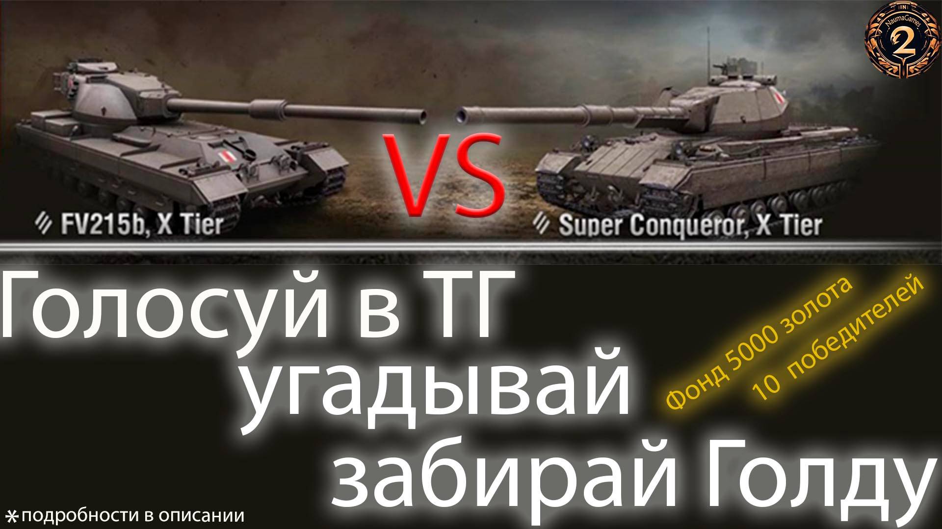 Стрим 26.08, но голосуй уже сейчас! Конкурс, «Кто Главный Дамагер?» Super Conqueror или FV215b Банк 5000голды - 10 победителей. Стримером будет проведено по 15 боев на каждом танке, правило простое, на каком танке средний урон будет больше по итогу, тот и победит. Условия для танков +/- одинаковые, больше зависит от рандома. Как принять участие? 1)Быть подписанным на канал, на котором смотрите. 2)Быть подписанным на ТГ: https://t.me/DvaNauma 3)Нажать кнопку принять участие под розыгрышем. 4)Под постом розыгрыша написать танк, за который болеете. Внимание! ! Писать можно только 1 раз. ! Исправлять комментарий запрещено. ! Возможность участвовать закроется за 2 часа до окончания конкурса. Банк 5000 голды!!! Как будут определены победители? Нужно соблюсти 4 пункта участника! Рандомайзер выберет 10 случайных участников, кто из 10 участников написал верный танк в комментариях, тот заберет 500 голды. Если все 10 угадают, значит все 10 получат по 500 голды! Удачи со ставками господа!