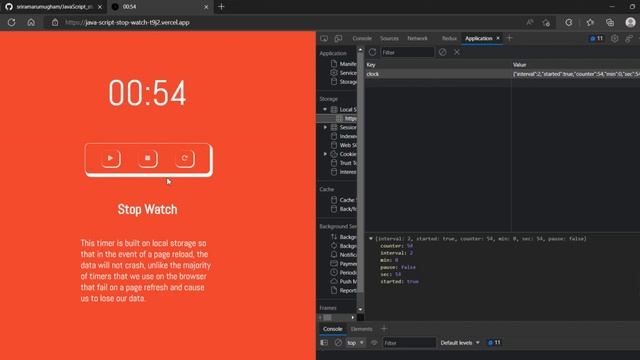A javascript timer runs based on the set interval function in javascript and calculates the min and seconds, displays it like a stopwatch Add a local storage feature to the timer to make the data persistent on a page refresh which makes the timer unique from what we use online github: https://github.com/sriramarumugham/JavaScript_stop_watch hosted on vercel: https://java-script-stop-watch-t9j2.vercel.app/