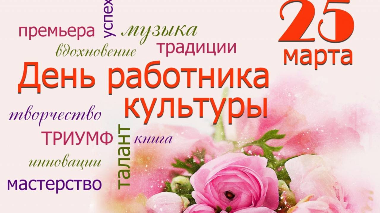 День работника культуры России 25 марта В этот день профессиональный праздник отмечают создатели и хранители культуры Культура родилась из культа. Истоки её — сакральны. Николай Бердяев День работника культуры отмечается в России ежегодно 25 марта. Этот профессиональный праздник деятелей культуры и искусства, людей творческих профессий, а также хранителей и популяризаторов культурного наследия установлен Указом Президента РФ № 1111 от 27 августа 2007 года. Мои контакты: Ютуб- https://www.youtube.com/channel/UC60YqkKksZaT2x-uLcUCCCg ВКонтакте- https://vk.com/oblinova1965 ОК- https://ok.ru/group/59523134783660/video/c4532140 Телеграм- https://web.telegram.org/a/#-1001443284231 BOOJTSY: https://boosty.to/obovsemponenozhku Рутуб: https://rutube.ru/channel/23344395/