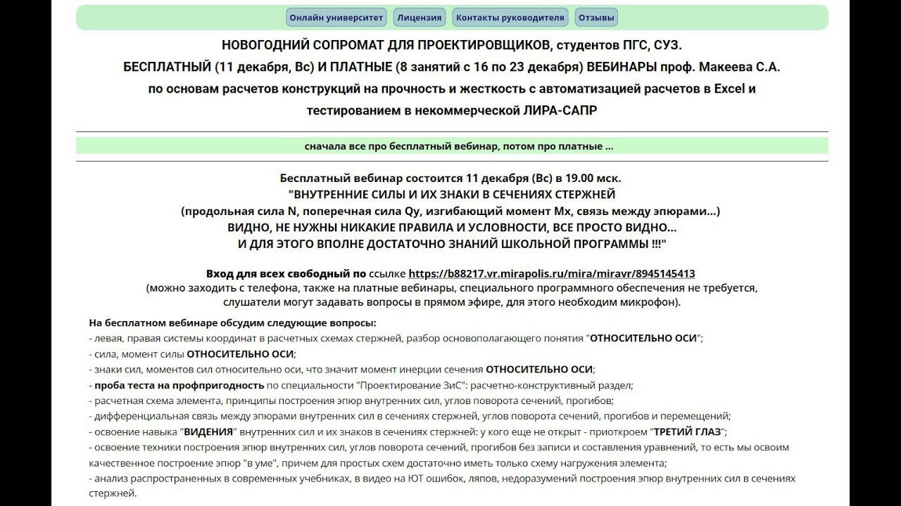 Ссылка на сайт вебинаров https://makeev.justclick.ru/01a_sopromat. Ссылка на бесплатный вебинар 11 декабря в 19.00 мск https://b88217.vr.mirapolis.ru/mira/miravr/8945145413 ВХОД СВОБОДНЫЙ. Ссылка на мой ЮТ канал "Сопромат - Тайные Знания" https://www.youtube.com/@makeev608079/videos. Ссылка на сайт онлайн университета https://sopromex.ru/ . Оформить подписку на все мои бесплатные видео материалы по основам расчетов конструкций на прочность и жесткость (это более 100 видео и авторские ПК, которые будут дозировано приходить к Вам на почту в течение 30 дней) можно на главной странице сайта онлайн университета https://sopromex.ru/ или на специальной странице подписки https://makeev.justclick.ru/podpiska_2020 .
