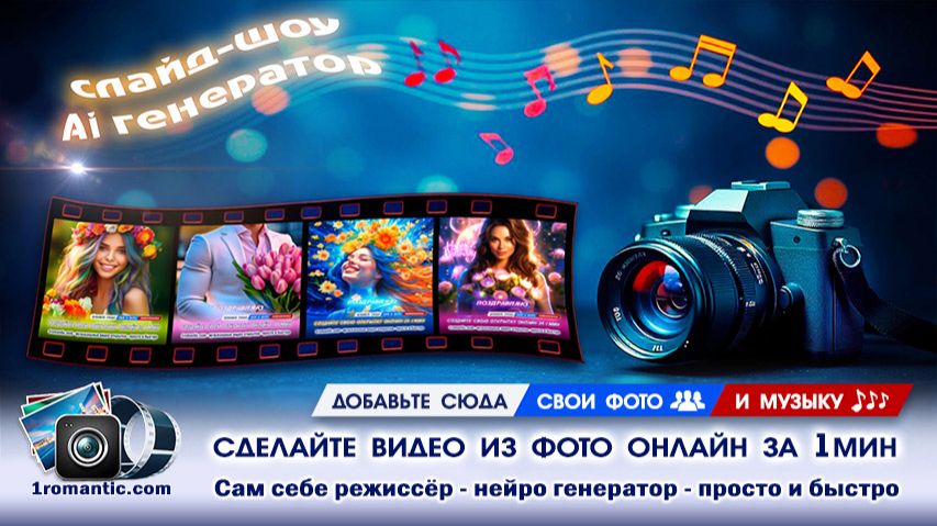 Сделать слайд-шоу здесь: https://1romantic.com/slideshow/online-maker/?p=431790 Сделайте слайд-шоу за 1 минуту онлайн бесплатно без регистрации — загрузите свои фото и музыку прямо в окно браузера.