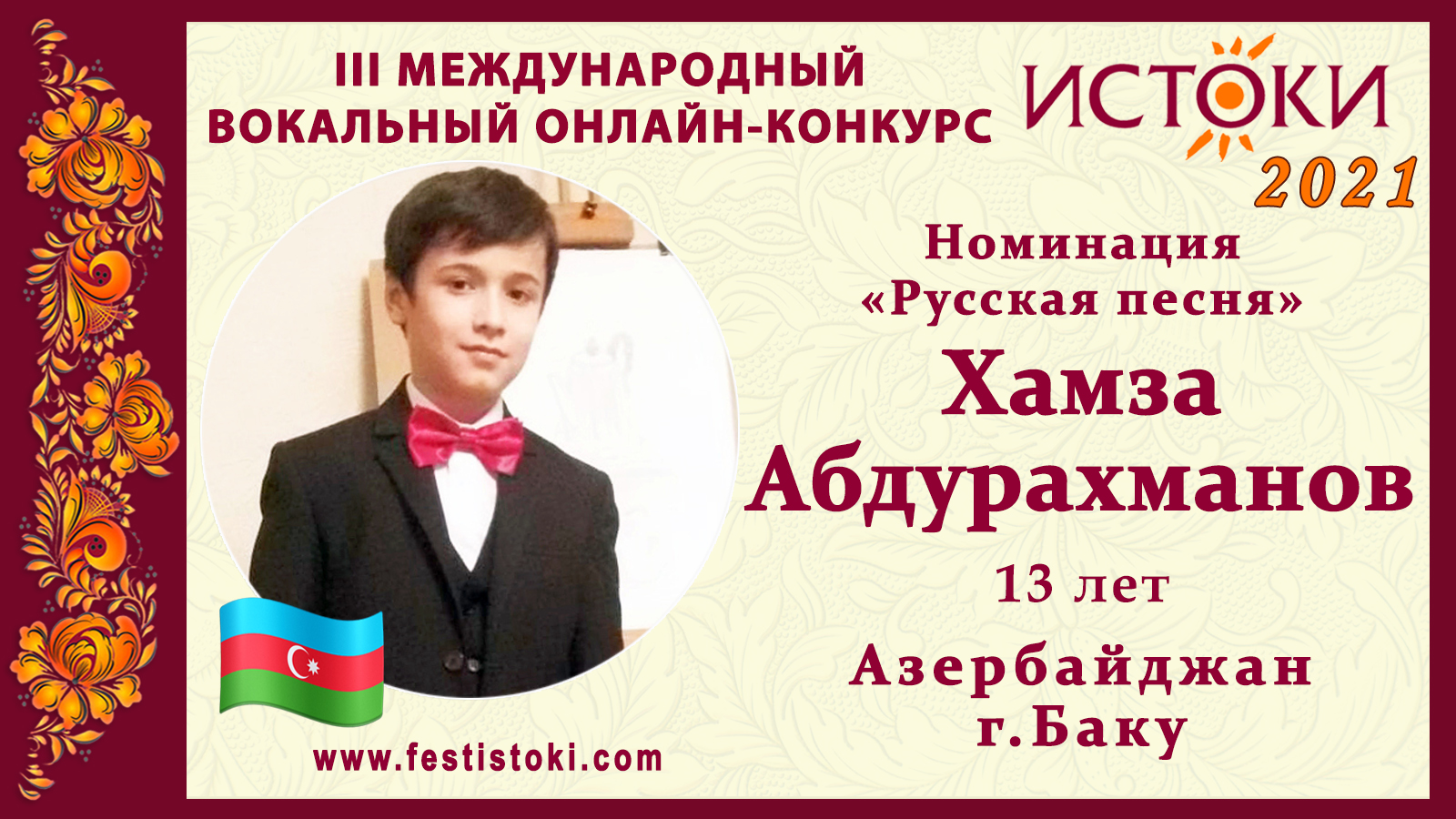 Лауреат I степени III Международного вокального онлайн-конкурса «Истоки». Номинация "Русская песня". Песня "Подмосковные вечера" Автор В.Соловьев-Седой Сайт: www.festistoki.ru / www.festistoki.com E-mail: festistoki@mail.ru