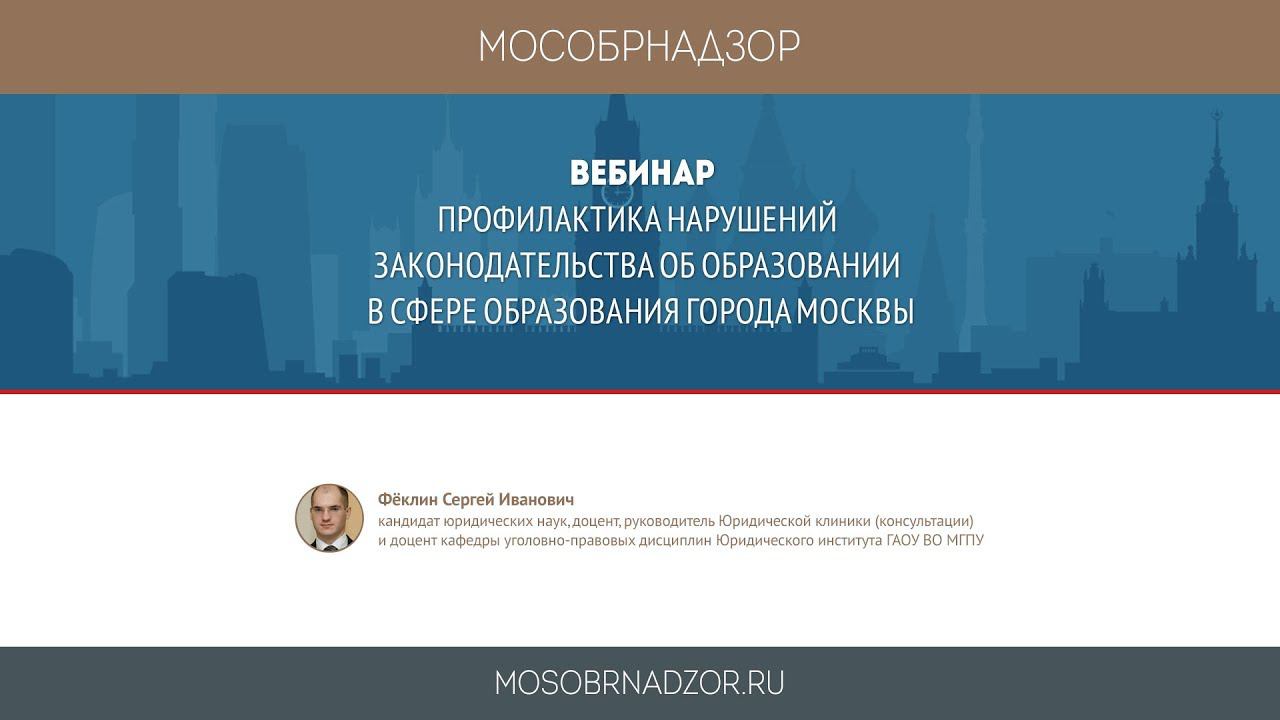 Вебинар «Профилактика нарушений законодательства об образовании в сфере образования города Москвы» был проведен в рамках проекта Мособрнадзор.РФ 5 октября 2017 года. Ведущий вебинара - Феклин С.И. Страница вебинара на сайте проекта - http://mosobrnadzor.ru/supervision/webinars/2017-10-05_12-00