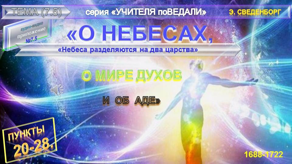 (5) (пункты 20-) раздела"Небеса разделяются на два царства" Книги "О НЕБЕСАХ, О МИРЕ ДУХОВ И ОБ АДЕ"-Эммануила Сведенборга (1688-1722). Знаменитый теософ и мистик Эммануил Сведенборг (1688—1722) в этом самом содержательном и любопытном своем труде изложил полученные им Знания посмертного существования, описывая различные Божественные Высшие, Ангельские Тонкие и иные миры, а также их Обитателей, включая мир Ада... Е.П. Блаватская высоко ценила труды Э. Сведенборга, прежде всего как теософа, называя его великим провидцем. Данный Книга содержит записи автора, имеющие сквозную нумерацию от 1 по 360. Все записи сгруппированы и представлены по-порядку изложения в соответствующем их тематике подразделе.