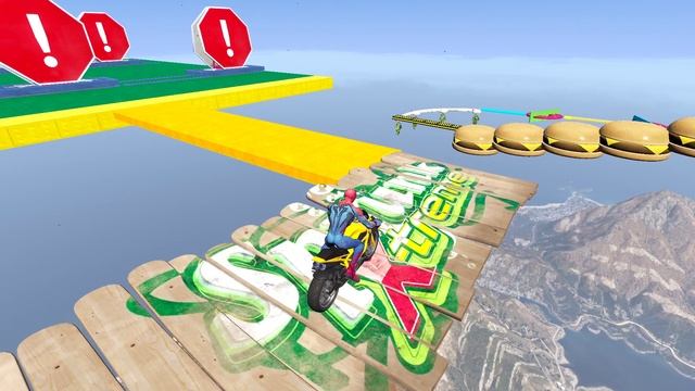 Человек паук и Лабубу на мотоциклах проехали дорогу с препятствиями. Мультик для малышей.