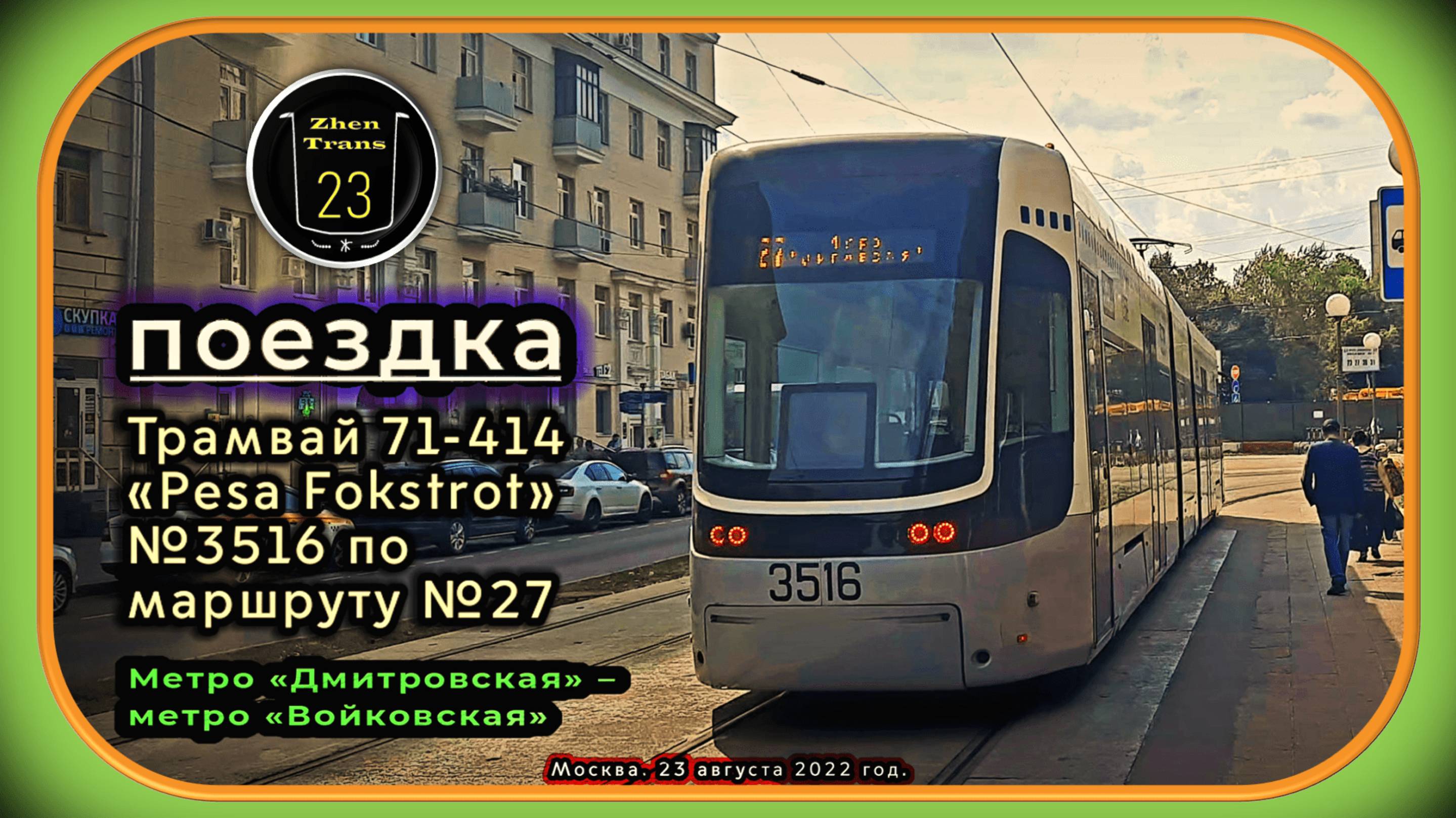 В этом видео я показал поездку на трамвае модели 71-414 «Pesa Fokstrot» №3516 по маршруту №27 от метро «Дмитровская» до метро «Войковская». Данная поездка теперь является исторической, так как данные трамваи теперь отстранены от эксплуатации в Москве из-за отсутствия запчастей. Но теперь сейчас они эксплуатируются в Уфе, там же появилась возможность заказать запчасти и восстановить вагоны. Последний день эксплуатации польских трамваев стал 3 декабря 2023 года, а 4 декабря были законсервированы. Дополнительно хочу ещё сказать, что на видео был наложен информатор диктора Максим Зубков, который до появления голоса Московского транспорта озвучивал многие маршруты наземного транспорта, в том числе в других городах, например в Туле. Я вставил его голос, потому что в данном вагоне на момент съёмки информатор не работал, поэтому я решил к исторической поездке немного добавить атмосферы прошлого. Снято 23 августа 2022 года. Поддержка моего канала - 2202 2023 6913 7413. Тайм-коды к видео: 00:00 – Начало. 00:24 – Трамвайное кольцо. Метро «Дмитровская». Подготовка к отправлению к метро «Войковская» трамвая модели 71-414 «Pesa Fokstrot» №3516. 00:43 – Дмитровский проезд. 01:21 – Улица Костякова. 05:20 – Улица Дубки. 09:10 – Тимирязевская улица. 14:20 – Улица Прянишникова. 16:05 – Михалковская улица. 18:35 – Соболевский проезд. 26:00 – Улица Клары Цеткин. 28:18 – Улица Зоя и Александра Космодемьянских. 33:06 – Трамвайное кольцо. Метро «Войковская». Заезд на кольцо трамвая модели 71-414 «Pesa Fokstrot» №3516. 33:37 – Концовка. VK страница: https://vk.com/evgeniynaumov23 Telegram-канал: https://t.me/ZhenTrans23 Telegram-группа: https://t.me/zhentrans23chat Дзен: https://dzen.ru/zhentrans23 RUTUBE: https://rutube.ru/channel/23921395/ YouTube: https://www.youtube.com/@zhentrans23/videos