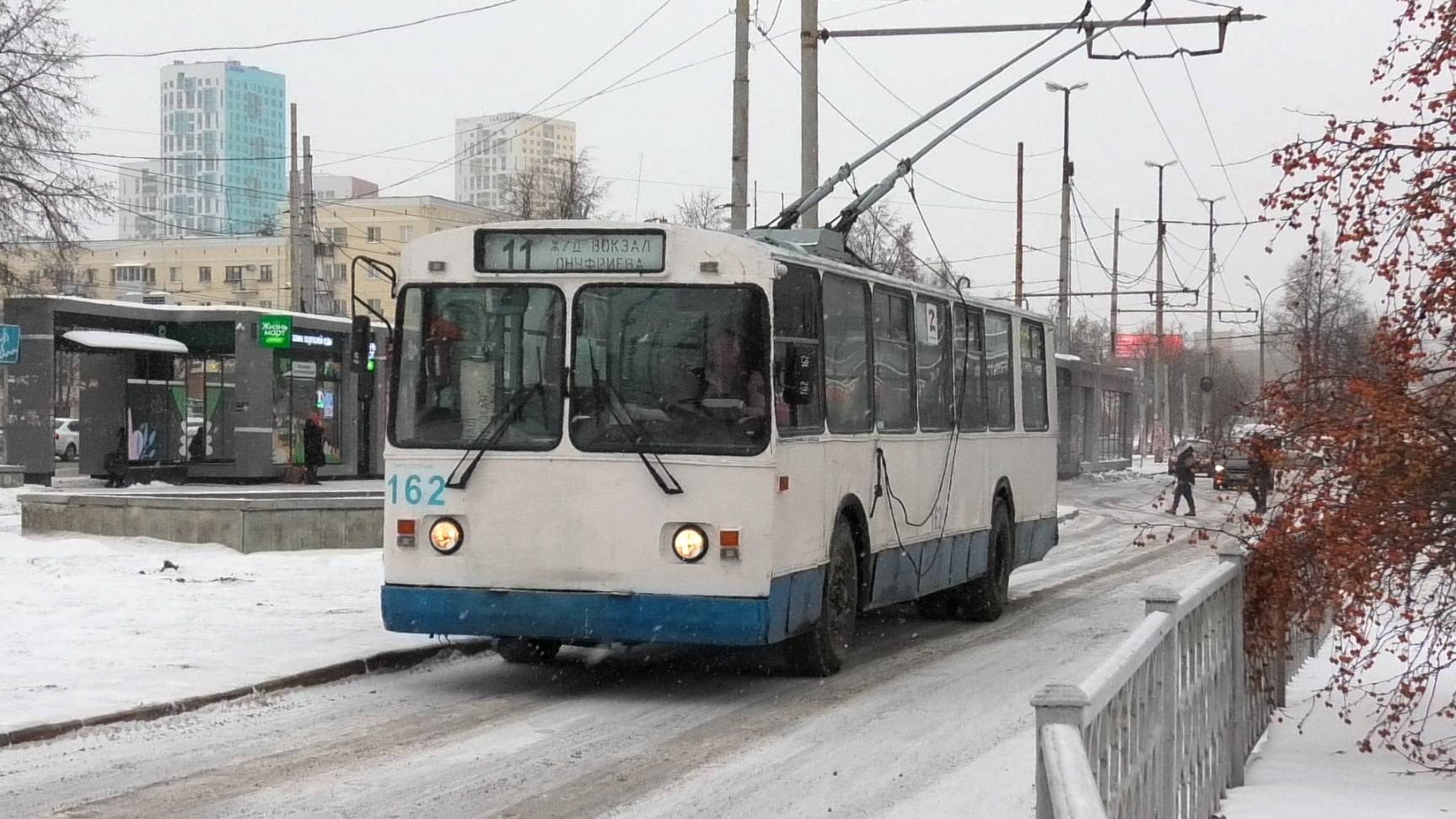 Троллейбус ЗиУ-682Г [Г00] борт. №162 маршрут №11 "ЖД вокзал - Онуфриева" отправляется с остановки "ЖД вокзал". Город Екатеринбург, Россия. Приписка: Октябрьское троллейбусное депо. 11.12.2022