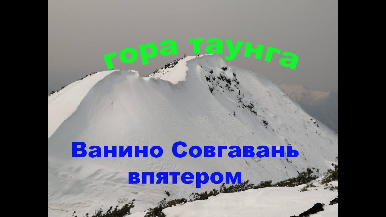 Впятером (Совгаванцы и Ванинцы) отправились покорить гору Таунга 2022г 20 апреля, по Лидоговской дороге, 153км от Ванино. Высота её 1459 метров. Снег метровый, мокрый и очень глубокий, боялись лавины, потому поднимались тихонько. Подниматься вертикально тяжело, скатываешься вниз, если снег срывается под ногами, тропы нет, не протоптано, сами тропили, ооочень тяжко глубокий снег пробивать. Сверху катятся огромные снежные комья, их ветром подрывает с верхушек, набирая скорость и размеры (снег мокрый) оня катятся на нас, уворачиваемся, чтою не убило ;) . На самый верх выкарабкались, а оказывается, самый пик горы еще дальше, надо опять спуститься и подняться на следующую гору - пик горы Таунга, его-то с дороги мы не видим. Всё же собрались духом и силами, преодолели последние метры. Рыхлый снег под ногами проваливался, 2022 год был обильно-снежным, мы утопали, скатывались обратно вниз, тормозили и как котята упрямо ползли на карачках, на животе вверх..., как буд-то на стену забирались. Мы молодцы!