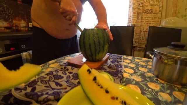 Влог. Пашка утром жёлтый арбуз решил испробовать, сладкий на вкус, кушать можно.