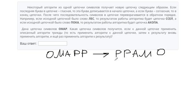 http://egoroffartem.pythonanywhere.com/oge/task/16 На сайте размещены другие задания по этой теме http://egoroffartem.pythonanywhere.com/oge/videotask/16 Список всех разборов 16 задания из ОГЭ по информатике: http://egoroffartem.pythonanywhere.com/oge/videotask/ Видео решения задач по ОГЭ информатике https://vk.com/egoroff_channel_oge В данном группе можете найти информацию о новых видео и задать вопросы по ОГЭ Информатике Разбор задания № 16 ОГЭ ИНФОРМАТИКА Тема задачи "Выполнение и анализ алгоритма для автомата" Некоторый алгоритм из одной цепочки символов получает новую цепочку следующим образом. Если последняя буква в цепочке – гласная, то эта буква дописывается в начало цепочки, а если буква – согласная, то в конец цепочки. После чего последовательность символов в цепочке переворачивается в обратном порядке. Например, если исходной цепочкой было слово ЛЕС, то результатом работы алгоритма будет цепочка ССЕЛ, а если исходной цепочкой было слово ПОКА, то результатом работы алгоритма будет цепочка АКОПА. Дана цепочка символов ОМАР. Какая цепочка символов получится, если к данной цепочке применить описанный алгоритм трижды (то есть применить алгоритм к данной цепочке, затем к результату вновь применить алгоритм, и ещё раз применить алгоритм к результату)?