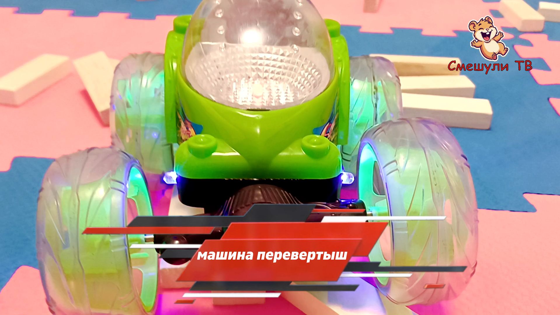 Большая машина перевертыш на радиоуправлении разрушает постройки.