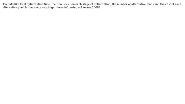 Databases: How to get the information of the optimizer of sql server? Helpful? Please support me on Patreon: https://www.patreon.com/roelvandepaar With thanks & praise to God, and with thanks to the many people who have made this project possible! | Content (except music & images) licensed under CC BY-SA https://meta.stackexchange.com/help/licensing | Music: https://www.bensound.com/licensing | Images: https://stocksnap.io/license & others | With thanks to user zli89 (dba.stackexchange.com/users/20554), user stan (dba.stackexchange.com/users/166977), and the Stack Exchange Network (dba.stackexchange.com/questions/33511). Trademarks are property of their respective owners. Disclaimer: All information is provided "AS IS" without warranty of any kind. You are responsible for your own actions. Please contact me if anything is amiss at Roel D.OT VandePaar A.T gmail.com