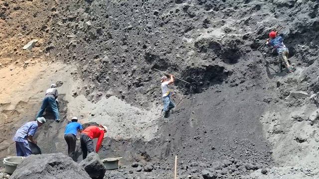 Строительство, шахтёры разбивают камни и загружают песок