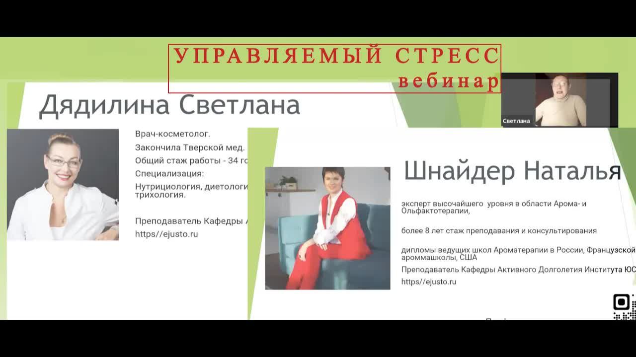 Вебинар кафедры реабилитации и активного долголетия ЮСТО: "Управляемый стресс - природа и причины. Выход из стресса через питание, витамины, ароматерапию". Проводят: Светлана Дядилина, Наталья Шнайдер, Екатерина Мотина. Управляемый стресс. Что хорошего в стрессе. Наше поведение в стрессовой ситуации. Самодиагностика. Выход из состояния через коррекцию питания, прием витаминов, при помощи ароматерапии. Безопасное использование эфирных масел. Помощь близким.
