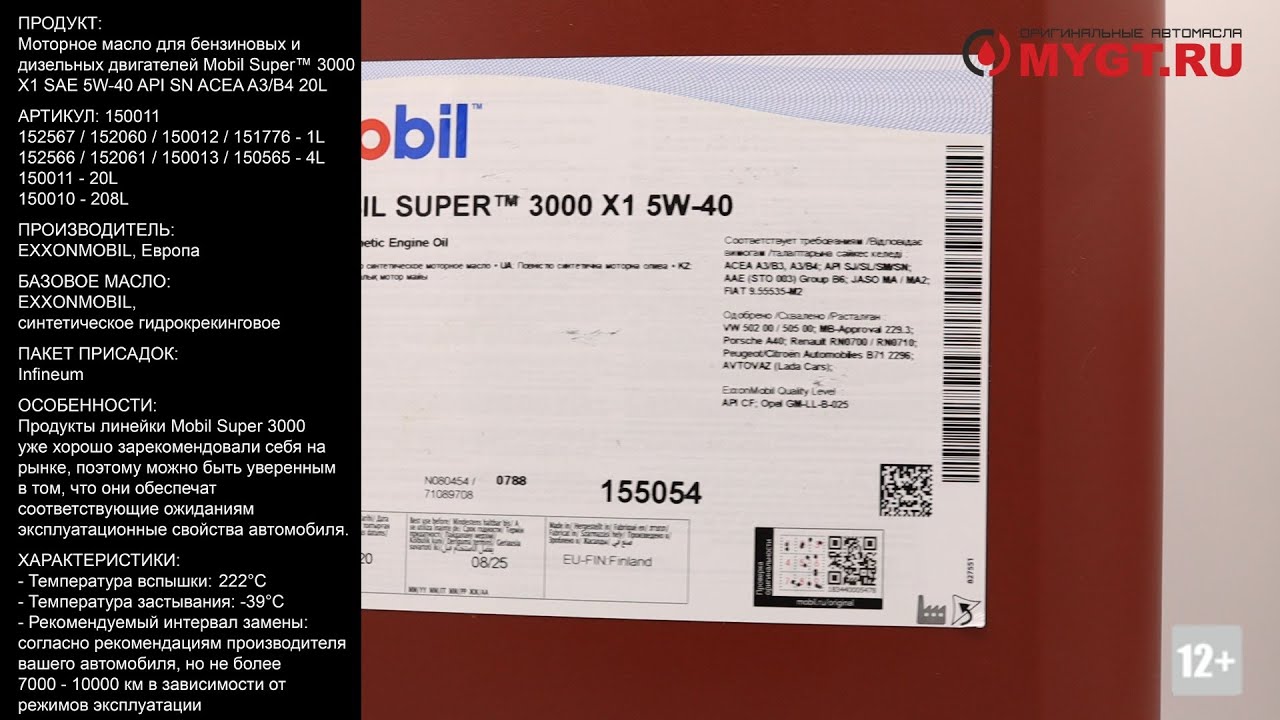 Продукт: Моторное масло для бензиновых и дизельных двигателей Mobil Super™ 3000 X1 SAE 5W-40 API SN ACEA A3/B4 20L Наш телефон: 8-800-550-57-22 ПН-ПТ 9.00-17.00 (МСК+4) Артикул: 150011 - 20L 152567 / 152060 / 150012 / 151776 - 1L 152566 / 152061 / 150013 / 150565 - 4L 150010 - 208L Производитель: EXXONMOBIL, Европа Базовое масло: EXXONMOBIL, синтетическое гидрокрекинговое Пакет присадок: Infineum https://mygt.ru/oil/mobil/mobil-super-3000-x1-5w-40-20-l.html Особенности: Продукты линейки Mobil Super 3000 уже хорошо зарекомендовали себя на рынке, поэтому можно быть уверенным в том, что они обеспечат соответствующие ожиданиям эксплуатационные свойства автомобиля. Mobil Super 3000 X1 5W-40 обеспечивает: Особенности • Улучшенную защиту при повышенных температурах • Улучшенные смазывающие свойства при холодном пуске • Улучшенную чистоту двигателя и защиту от образований отложений и шлама • Усиленную защиту от износа Применение Состав масел Mobil Super 3000 уверенно обеспечивает эффективную защиту. ExxonMobil рекомендует применять Mobil Super 3000 X1 5W-40, если регулярно возникают сложные условия вождения, чтобы предотвратить повреждения от интенсивных и частых нагрузок в: • Двигателях различных типов • Бензиновых и дизельных двигателях без дизельных сажевых фильтров (DPF) • В легковых автомобилях, внедорожниках, малотоннажных грузовиках и микроавтобусах • При движении по автострадам, а также в городских условиях с частыми остановками • В двигателях с повышенными рабочими характеристиками • В обычных условиях эксплуатации и при движении с перегрузками • В двигателях с турбонаддувом и с прямым впрыском топлива Всегда сверяйтесь с руководством по эксплуатации своего автомобиля для правильного выбора масла по его свойствам и классу вязкости. Спецификации и одобрения: Mobil Super 3000 X1 превосходит следующие требования или соответствует им: ACEA A3/B3, A3/B4 API SN/SM AAE (STO 003) Group B6 Имеет следующие одобрения производителей оборудования к применению: MB-Approval 229.3 VW 502 00/505 00 BMW Longlife-01 Porsche A40 Peugeot/Citroën Automobiles B71 2296 Renault RN0710 / RN0700 AVTOVAZ (автомобили “Лада”) ExxonMobil рекомендует применять данное масло там, где требуются: API CF Opel GM-LL-B-025 Характеристики: - Кинематическая вязкость при 100°C, ASTM D445: 14сСт - Кинематическая вязкость при 40°C, ASTM D445: 84сСт - Зольность сульфатная ASTM D874: 1.1% мас. - Содержание фосфора: 0.0095 - Плотность при 15ºC, ASTM D 4052: 0.855кг/л - Температура вспышки (PMCC), ASTM D92: 222°C - Температура застывания, ASTM D97: -39°C - Рекомендуемый интервал замены: согласно рекомендациям производителя вашего автомобиля, но не более 7000 - 10000 км в зависимости от режимов эксплуатации Отличие упаковки оригинала: - Канистра произведена компанией Greif (логотип на дне) - Фирменная система защиты EXXONMOBIL с QR кодом и алгоритмом проверки. Подробные инструкции в описании - Двухслойная этикетка на передней части канистры имеет клеевой слой - Передняя этикетка имеет элементы, которые светятся при свете ультрафиолета (полоса сверху, полоса снизу, буква Е в нижнем правом углу этикетки) Ссылки на дополнительные материалы по продукту, а также SDS и PDS: http://nskrobot.ru/images/FOTO/MYGT_RU/Mobil_Super_3000-X1-5W-40_SDS_MYGT_RU.pdf http://nskrobot.ru/images/FOTO/MYGT_RU/Mobil_Super_3000-X1-5W-40_TDS_MYGT_RU.pdf ЧТО ДЕЛАТЬ, ЕСЛИ ВЫ ПРИОБРЕЛИ НЕ ПОДЛИННЫЙ ПРОДУКТ? Если после сканирования QR кода или проведения идентификации на сайте mobil.ru/original, вы пришли к выводу, что купленный вами продукт не является оригинальным, согласно ст. 18 Закона «О защите прав потребителей» вы имеете право отказаться от исполнения договора купли-продажи и потребовать возв