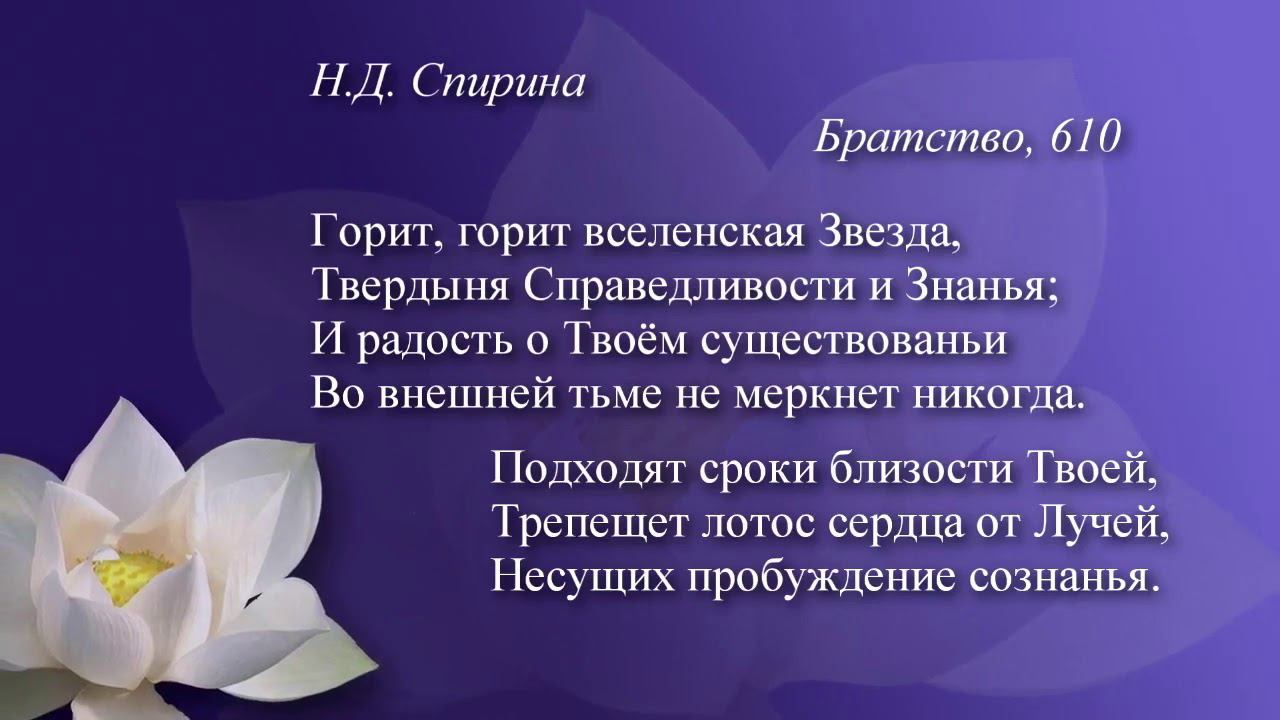 ГОРИТ, ГОРИТ ВСЕЛЕНСКАЯ ЗВЕЗДА... Наталия Спирина * * * Братство, 610 Горит, горит вселенская Звезда, Твердыня Справедливости и Знанья; И радость о Твоём существованье Во внешней тьме не меркнет никогда. Подходят сроки близости Твоей, Трепещет лотос сердца от Лучей, Несущих пробуждение сознанья. 7.08 – 1.09.1956 г. • Рериховская поэзия на сайте СибРО: http://sibro.ru/poetry/ #НаталияСпирина, #поэзияновойэпохи, #ПоэзияСпириной -------------------------------------------- О Наталии Дмитриевне Спириной: * Сайт, посвященный Н.Д. Спириной: https://spirina.info * Раздел на сайте СибРО: http://sibro.ru/teacher/spirina/ * Читать стихи: https://sibro.ru/poetry/ * Плейлист "Наталия Спирина. Стихи": https://www.youtube.com/playlist?list=PLRDwJtqWLAx6FDWLWUSyVeqmBAs0Cfx7c * Видеофильмы о Н.Д. Спириной: https://www.youtube.com/playlist?list=PLRDwJtqWLAx7zdjQRW1u5QSUW3T6SJ4rj * Вконтакте: https://vk.com/natalia.spirina * Telegram: https://t.me/SpirinaN • Рериховская поэзия: https://www.youtube.com/playlist?list=PLRDwJtqWLAx6Q4cJ_smGoz7zmaKXZee-N • Рериховская поэзия на сайте СибРО: http://sibro.ru/poetry/ -------------------------------------------- Помочь проектам СибРО: https://sibro.ru/dari-dobro/ Благодарим всех наших помощников и приглашаем к сотрудничеству! -------------------------------------------- /// Ссылки на ресурсы СибРО: Канал Сибирского Рериховского Общества и Музея Николая Рериха в Новосибирске https://www.youtube.com/c/videosibro Канал «Трансляции СибРО» https://www.youtube.com/c/telesibro ВКонтакте: «СибРО. Трансляции»: https://vk.com/telesibro Сайт СибРО: https://sibro.ru Сайт наследия Н.Д.Спириной: https://spirina.info Вконтакте: https://vk.com/roerichmuseumnsk Однокласники: https://ok.ru/roerichmuseum Telegram: https://t.me/RoerichN Дзен: https://dzen.ru/roerichmuseum Rutube: https://rutube.ru/channel/24606905/ Интернет-магазин "Искры Света": https://knigisibro.ru или на Ozon: https://www.ozon.ru/publisher/rossaziya-5101720/ Книги издательства СибРО "РОССАЗИЯ": https://rossasia.sibro.ru/knigi/