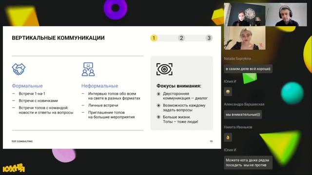 «0:08» - знакомство с консультантами «3:25» - основные форматы работы «7:08» - почему крупные компании возвращают сотрудников в офис? «9:53» - проблемы разных форматов «14:38» - практики взаимодействия - инструмент поддержания вовлеченности «19:54» - вертикальные коммуникации: зачем они нужны? «47:11» - горизонтальные коммуникации: как с ними работать? «1:15:03» - психологический комфорт и чувство сопричастности «1:20:37» - совершенствование практик коммуникации: с чего начать? «1:23:57» - золотые правила коммуникаций «1:25:11» - про нашу компанию